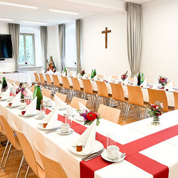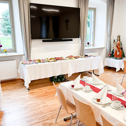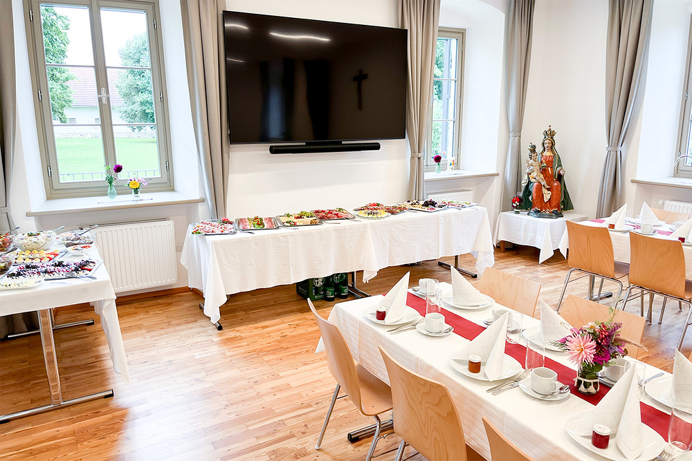 Der Pfarrhof Dobl wurde 2025 umfassend renoviert und präsentiert sich heute als moderner, offener und einladender Ort der Begegnung. Das Erdgeschoss mit dem großzügigen Pfarrsaal für bis zu 60 Personen, ausgestattet mit 86-Zoll-Flachbildschirm, moderner Tontechnik, einer vollständig eingerichteten Küche sowie WC-Anlagen und einem freundlichen Vorraum, steht für verschiedenste Anlässe zur Verfügung: Agapen nach Messfeiern, Taufen, Firmungen, Hochzeiten sowie private Feiern und Veranstaltungen.