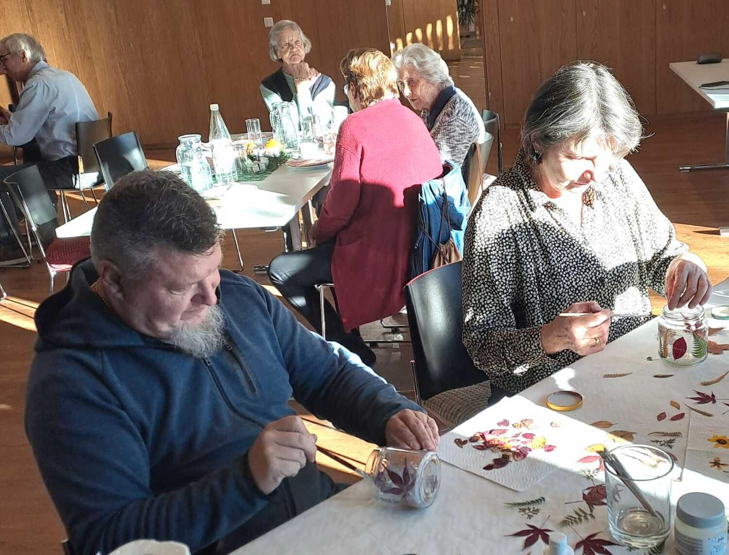 Am Festtag des Heiligen Martin trafen sich die Gäste des Seniorennachmittags wieder in gemütlicher Runde zum angeregten Austausch, zum Karten spielen und begeisterte Bastler:innen waren eingeladen, selbst Lichtgläser und Kerzen mit bunten Herbstblättern zu verzieren.