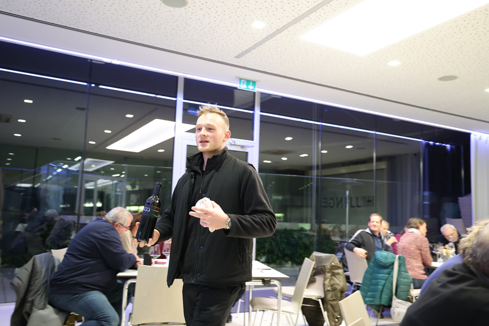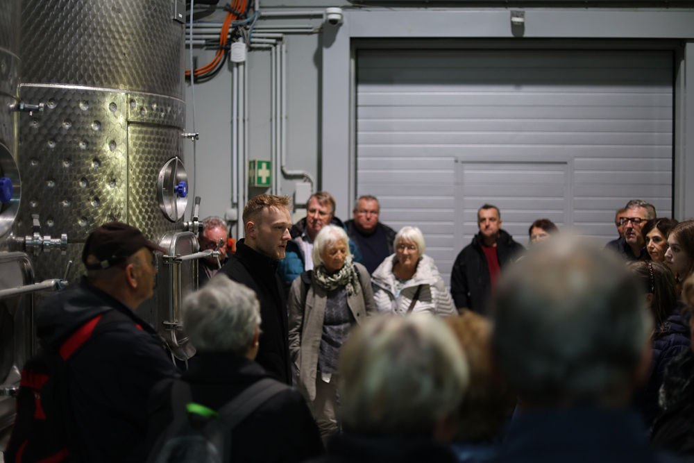 Zum krönenden Abschluss fuhren wir weiter nach Jois im Burgenland zum Weingut Leo Hillinger. Zuerst wurden wir durch den Weinkeller geführt. Zwischen Stahltanks und Barriquefässern konnten wir alle möglichen Fragen zum Wein und Weingut stellen. Im Gebäude darüber konnten wir mit Blick auf den Weinkeller vier Weine verkosten. Zur Stärkung durfte eine Jause dazu nicht fehlen.